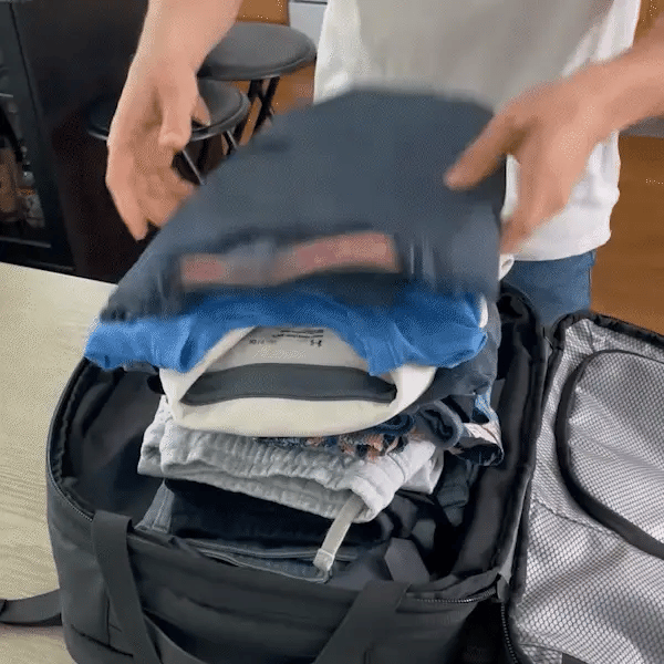 A: VacSecure™ uses a built-in compression system that removes excess air from inside the bag, allowing your items to compress down significantly. Simply pack your belongings, close the compartment, and activate the vacuum feature. Within seconds, the internal space reduces and your load becomes more compact. This helps you fit more without increasing bulk.